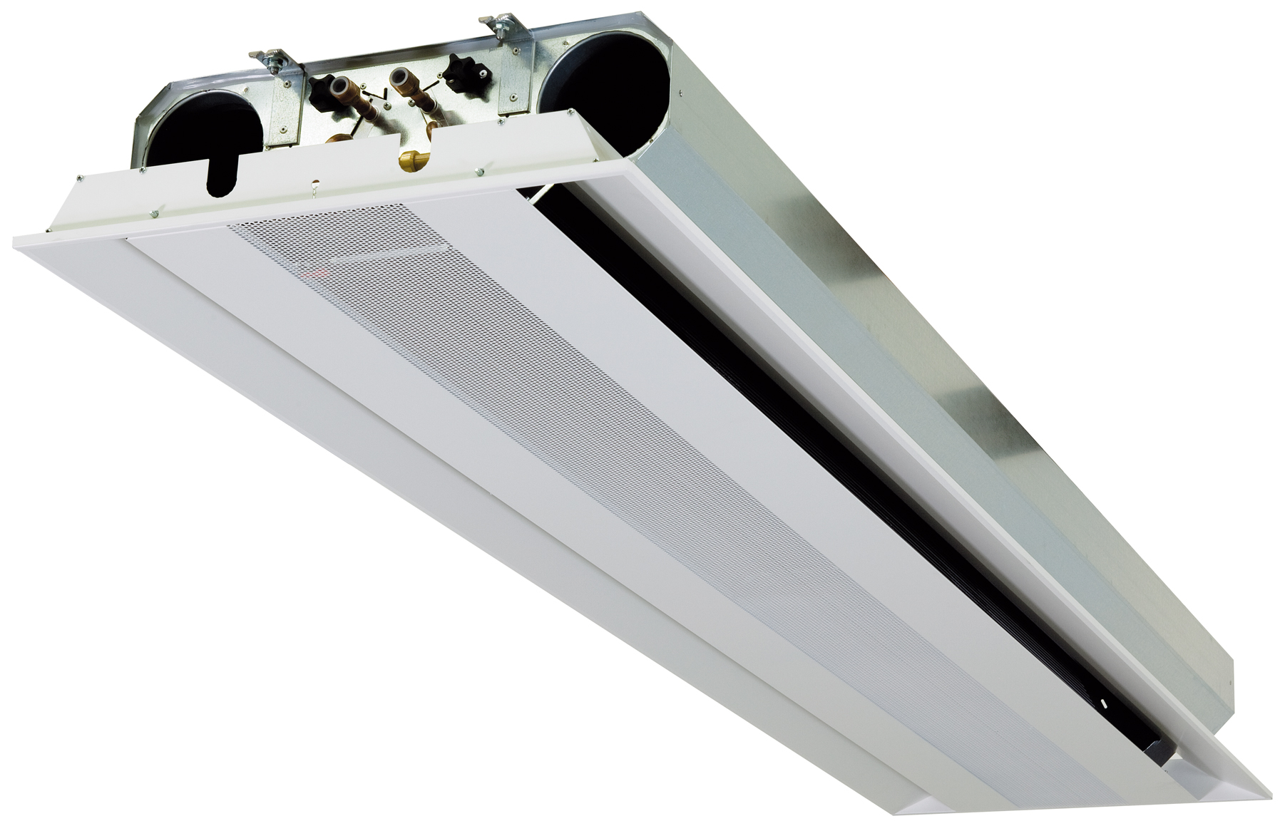 È equipaggiata del sistema brevettato Roccheggiani ad ugello direzionabile che consente di variare la direzione del lancio dell’aria in ambiente senza riduzione di resa e del sistema di regolazione “TRIM” della portata d’aria integrato. La porzione a vista è verniciata a polvere ed è disponibile in qualsiasi colorazione. Tutte le parti meccaniche, comprese valvole di regolazione, attuatori e sonda anticondensa possono essere montate a bordo trave e sono raggiungibili aprendo a compasso il pannello inferiore. È inoltre possibile integrare anche l’estrazione, a bordo del terminale stesso. La porzione a vista è indipendente dalla lunghezza della parte attiva e sono realizzabili soluzioni continue con molteplici terminali esteticamente collegati in serie.
