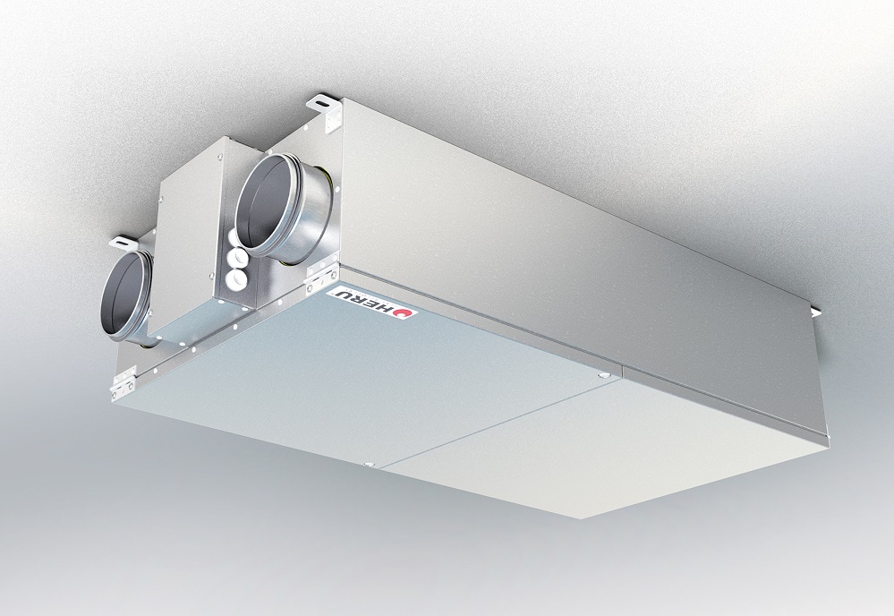 HERU 90LP EC è molto compatta nelle dimensioni ma potente nelle prestazioni aerauliche, infatti raggiunge una portata d’aria di 360 mc/ora a 100 Pa di pressione, le misure sono molto contenute: L. 961x P. 540x H. 253mm, gli attacchi dei tubi sono da 125 mm.
