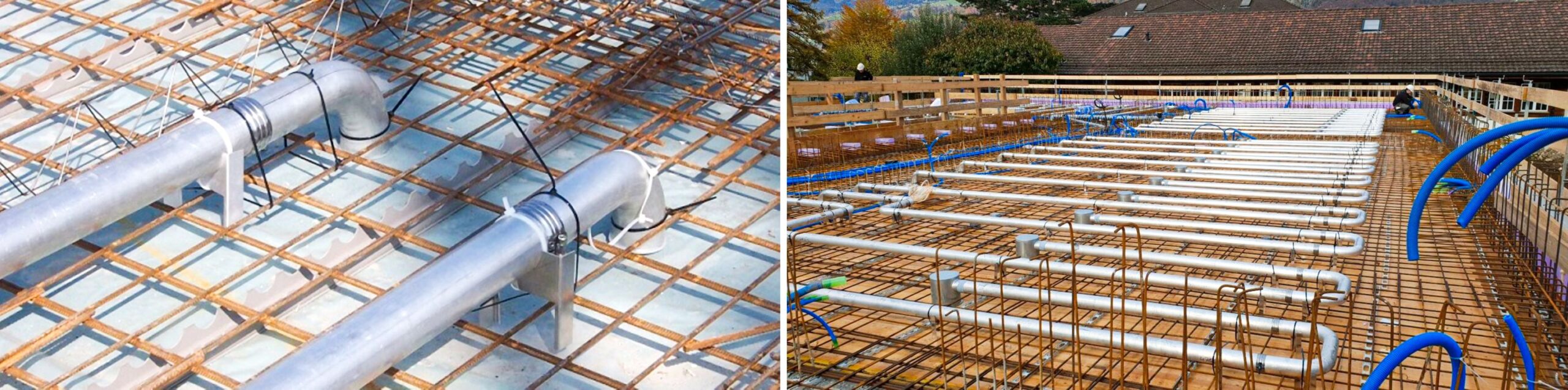 I tubi vengono posati all’interno dell’armatura e successivamente annegati direttamente nel getto (figura 3). Il calcolo dell’interasse e dello sviluppo del percorso delle serpen­tine del tubo di raffreddamento si base sul fabbisogno frigorifero e sulla portata d’aria richiesta da ogni ambiente (figura 4).