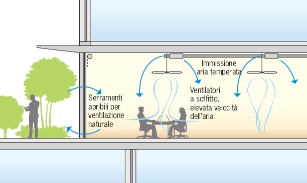 L’utilizzo di elevate velocità dell’aria costituisce una pratica a lungo adottata come mezzo per compensare temperature ambiente più elevate. Mediante i modelli di tipo adattivo il comfort termico può essere valutato in modo affidabile per un’ampia gamma di sei parametri ambientali e soggettivi: temperatura dell’aria, temperatura radiante media, umidità relativa, velocità dell’aria, fattore di abbigliamento e tasso metabolico. In questo modo può essere ben rappresentato l’effetto di raffreddamento ottenuto con un’elevata velocità dell’aria. Il rispetto degli obiettivi di comfort si ottiene quando il 90% degli occupanti è soddisfatto delle condizioni ambientali. Questo approccio consente di valutare strategie alternative per il benessere, come ad esempio quelle basate su sistemi ibridi. In questi sistemi l’elevata velocità dell’aria si combina con l’immissione di aria temperata e con la progettazione di edifici in cui le facciate sono apribili per sfruttare la ventilazione naturale.