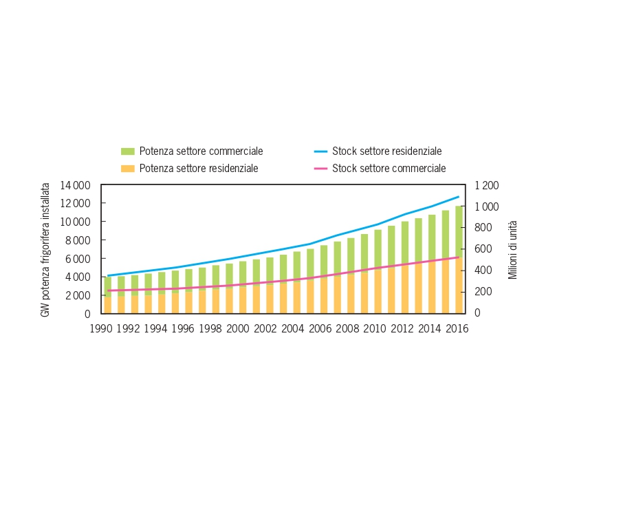 In base agli ultimi dati forniti dalla IEA (International Energy Agency) attualmente nel mondo ci sono 1,6 miliardi di impianti, che consumano il 10% del totale dell’energia elettrica. Di questi, circa 1 miliardo è di tipo residenziale, mentre la parte restante è riferibile al settore commerciale. In termini di potenza frigorifera installata, essa è salita da circa 4 GW nel 1990 a 11,6 GW nel 2016.