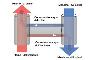La linea di bypass ha la funzione di separare idraulicamente il circuito primario dei gruppi frigoriferi da quello secondario che serve le utenze. Essa può essere percorsa nei due sensi.