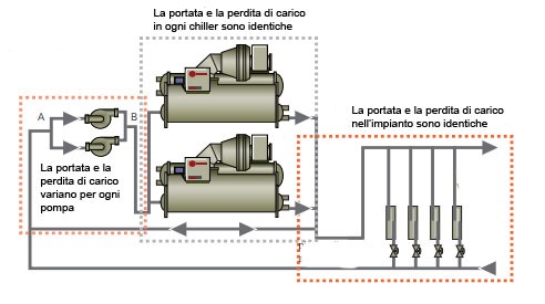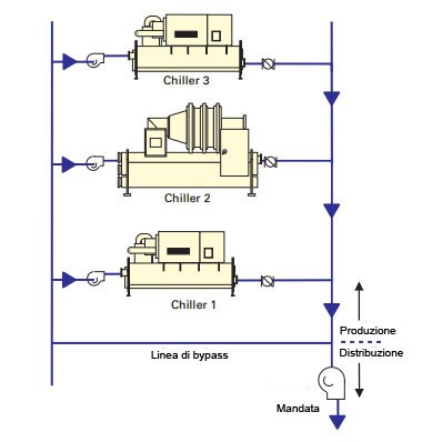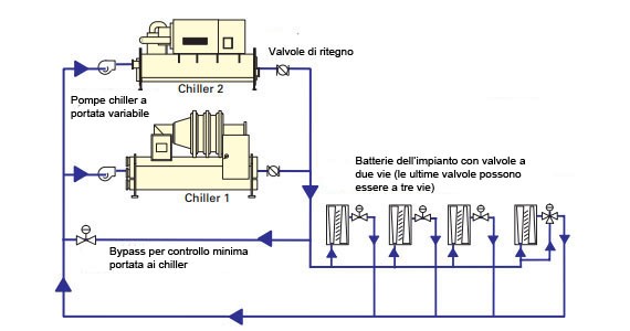 È necessario però che i chiller siano previsti per funzionare con portata variabile all’evaporatore (pressoché tutti i chiller moderni lo sono).