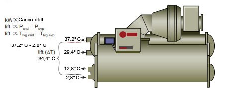 I compressori dei gruppi frigoriferi hanno la funzione di comprimere il refrigerante dalla pressione di evaporazione a quella di condensazione. Con terminologia anglosassone, questo aumento di pressione si chiama “lift” (Nel seguito continueremo ad usare questo termine, perché, per quel che ci consta, non esiste un soddisfacente equivalente italiano). Ma anziché la pressione è più comodo riferirsi al salto di temperatura fra evaporazione e condensazione; ciò è lecito perché il refrigerante è saturo sia nell’evaporatore che nel condensatore, e quindi esiste una corrispondenza biunivoca fra temperatura e pressione. Per semplificare, il “lift” è approssimativamente pari alla differenza fra la temperatura dell’acqua uscente al condensatore e quella uscente all’ evaporatore.