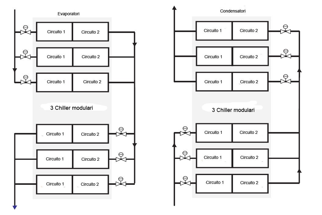 Se poi i gruppi sono tre o più, è possibile prevedere dei collettori con valvole di sezionamento motorizzate, in modo che uno qualsiasi dei chiller a monte possa operare con uno qualsiasi dei chiller a valle, assicurando la stessa ridondanza che si avrebbe se i chiller fossero in parallelo. La soluzione è illustrata in figura 8.