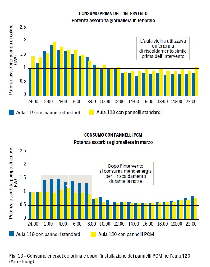 Complessivamente sono stati installati 144 pannelli PCM in ogni aula, che rappresenta­no una copertura di circa 30 metri quadrati. Pertanto, il calore giornaliero spostato dal PCM dal giorno alla notte è risultato di cir­ca 750 Wh per ogni aula. Nei mesi di marzo e aprile nell’aula 217 il consumo di energia totale medio nelle ore notturne (dalle 21 alle 7) è stato di 4,5 kWh. Supponendo un COP pari a 3 per la pompa di calore, il risparmio energetico notturno del 5-9% rappresenta circa 675-1300 Wh di calore risparmiato, in accordo generale con i 760 stimati di calore rilasciato dai pannelli PCM durante la notte.
