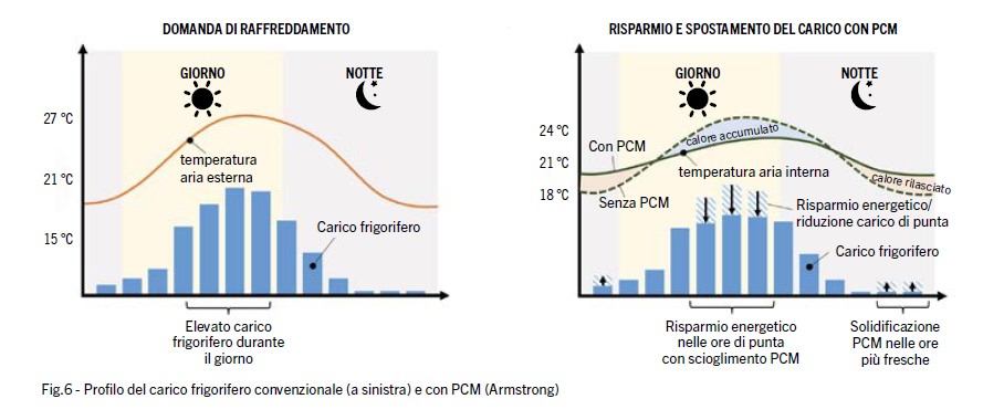 La sera e di notte, quando le temperature scendono, il PCM ri­lascia il calore accumulato e si ricarica per il giorno successivo. Lo sfasamento termico dal giorno alla notte permette di ridurre il carico di raffreddamento meccanico moderando al tempo stes­so la variazione di temperatura dell’ambiente.