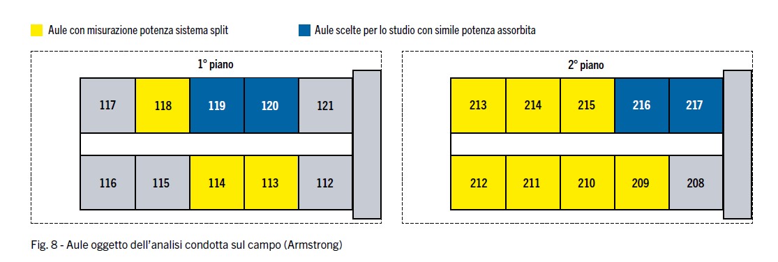 Per lo studio è stata selezionata un’ala com­posta da aule con caratteristiche simili in termini di dimensioni e utilizzo, ognu­na con una superficie di circa 74 metri quadrati e riscaldata da un sistema a pompa di calore di tipo split (figura 7). L’uniformità delle aule riscaldate con si­stemi autonomi ha consentito di isolare l’effetto fornito dal controsoffitto PCM.