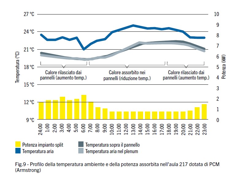Per stimare l’effetto dei PCM è stata ese­guita per le aule del secondo piano l’analisi riferita al mese precedente e successivo alla loro installazione (febbraio e marzo). In base alla temperatura esterna e alla varia­zione media delle misurazioni della poten­za, i valori della potenza assorbita misurata nelle ore notturne sono diminuiti in media del 6%. La variazione diurna della tempera­tura del pannello del controsoffitto e le sue proprietà entalpiche sono state utilizzate per stimare in modo indipendente la quan­tità di calore spostata dal PCM dal giorno alla notte. Nei mesi di marzo e aprile, la variazione media della temperatura diurna del controsoffitto con PCM è stata di circa un grado, corrispondente alla temperatura dell’aria del plenum vicino al soffitto. Il raf­freddamento da 21 a 20 °C corrisponde a un rilascio di calore di circa 25 Wh per me­tro quadrato dal PCM all’ambiente.