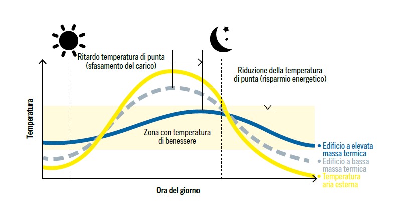 I materiali con massa elevata come il cemento e i mattoni sono in grado di assorbire una notevole quantità di calo­re e aumentano l’inerzia termica dell’edificio. Gli edifici realizzati con questi materiali tendono quindi a cambiare temperatura in modo più graduale, mantenendosi più vicini alla media dell’escursione termica tra giorno e notte. Questo effetto stabilizzante può ritardare e ridurre la richiesta di riscaldamento e raffreddamento meccanico durante le ore di punta, garantendo quindi vantaggi in termini di minore potenza frigorifera installata, risparmio energetico e comfort termico (fi­gura 1).