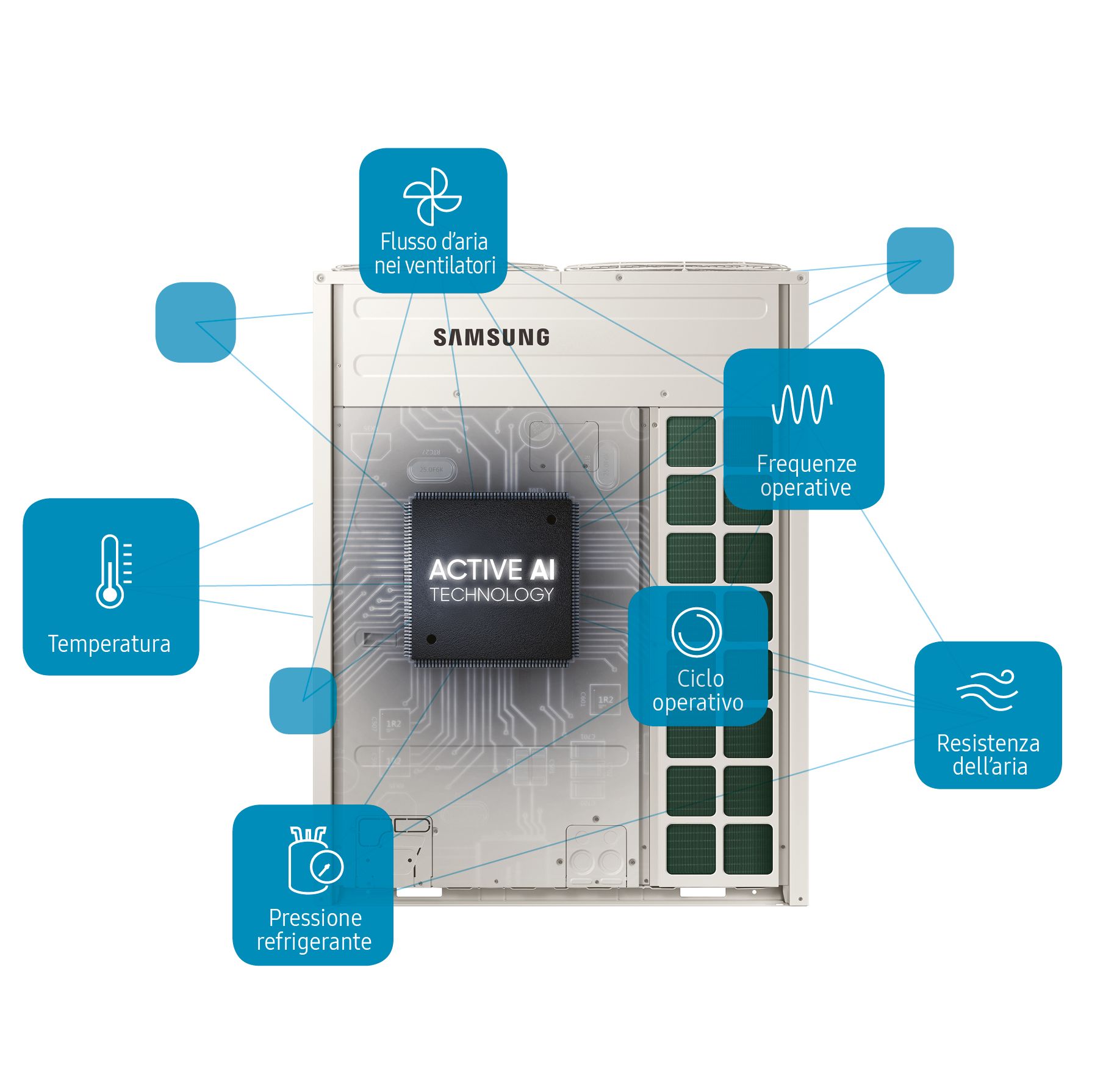 Inoltre, la tecnologia IA ottimizza lo sbrinamento analizzando oltre ai parametri convenzionali, quali temperatura esterna e temperatura/pressione del gas refrigerante, anche l’assorbimento del ventilatore e la resistenza dell’aria. Elaborando questi parametri mediante l’algoritmo, l’unità esterna effettua lo sbrinamento solo quando è necessario, evitando quindi inutili interruzioni del funzionamento ed inversioni di ciclo garantendo un continuo riscaldamento nell’ambiente.