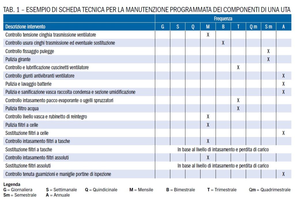 La tabella 1 mostra la scheda relativa ai diversi componenti di un’unità di trattamento aria. La frequenza indicata è da ritenersi di puro riferimento e sempre soggetta a modifica in funzione di quanto riportato sul manuale di manutenzione specifico del costruttore.