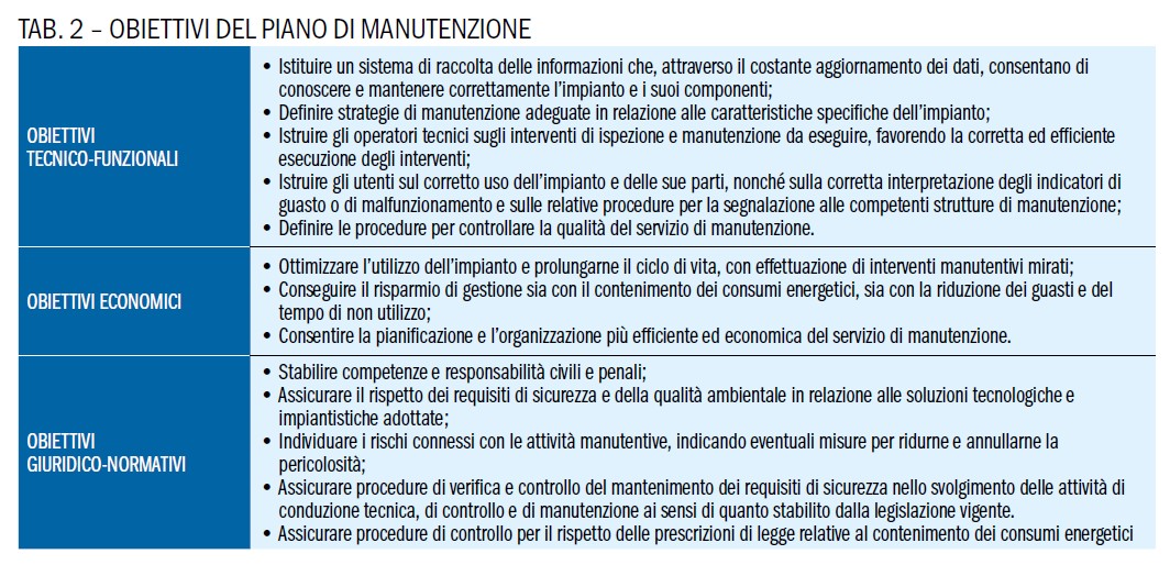 In linea generale i compiti dello studio e dell’organizzazione di una corretta manutenzione consistono nel fissare gli obiettivi per ciascun componente e sistema impiantistico, individuando la strategia ottimale e il costo complessivo da sostenere, sce­gliendo la forma di contratto più idonea e operando in modo da ottenere le migliori prestazioni possibili con un accettabile im­piego di risorse umane e materiali.