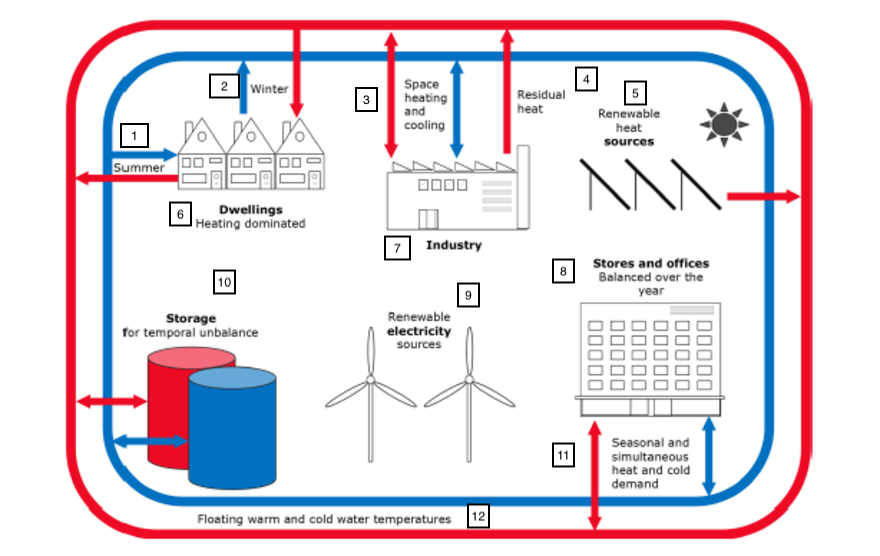 Come verrà illustrato nei casi di studio, può anche essere conveniente realizzare sistemi di tipo ibrido dotando i singoli edifici di centrali per la produzione/o l’accumulo dell’energia termofrigorifera per l’integrazione della capacità fornita dalla rete di distribuzione.