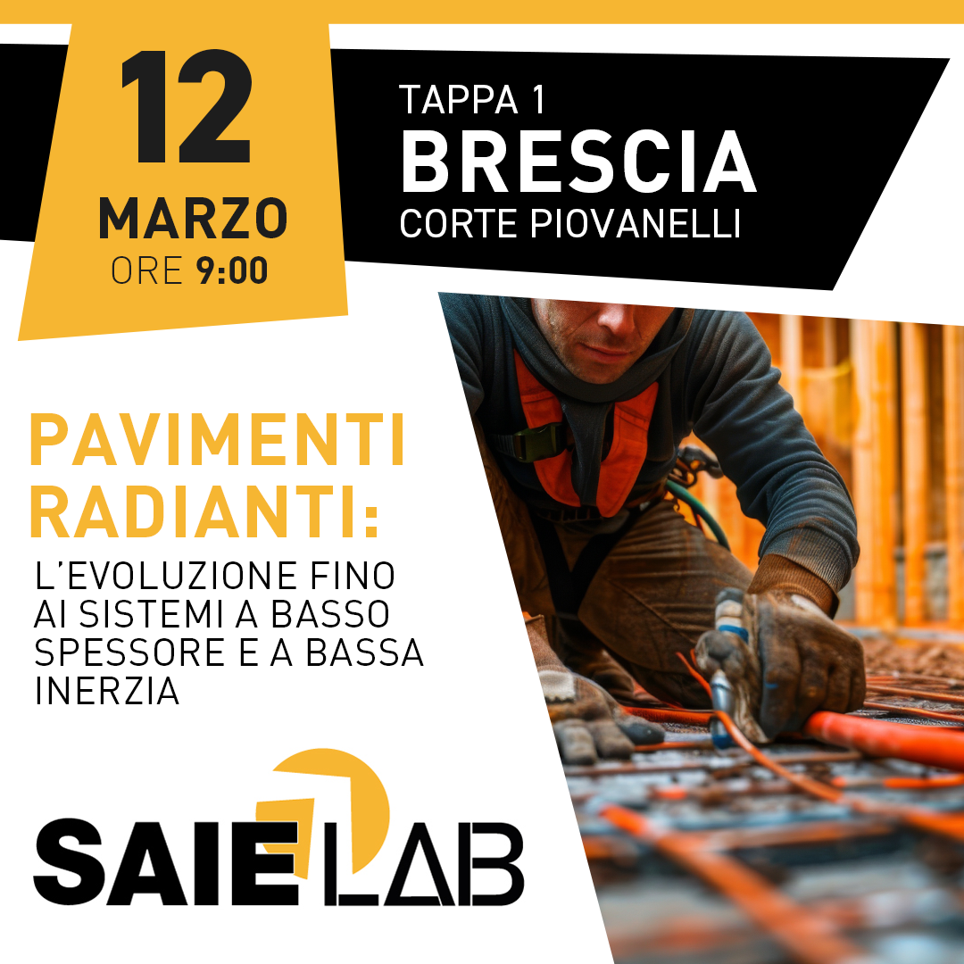 La prima tappa dei SAIE LAB 2025 si terrà a Brescia (presso la Corte Piovanelli, 12 marzo – ore 9.00 – 13.00) con un focus sulle soluzioni tecnologiche e applicative per i pavimenti radianti a basso spessore e a bassa inerzia, affrontando le seguenti tematiche: