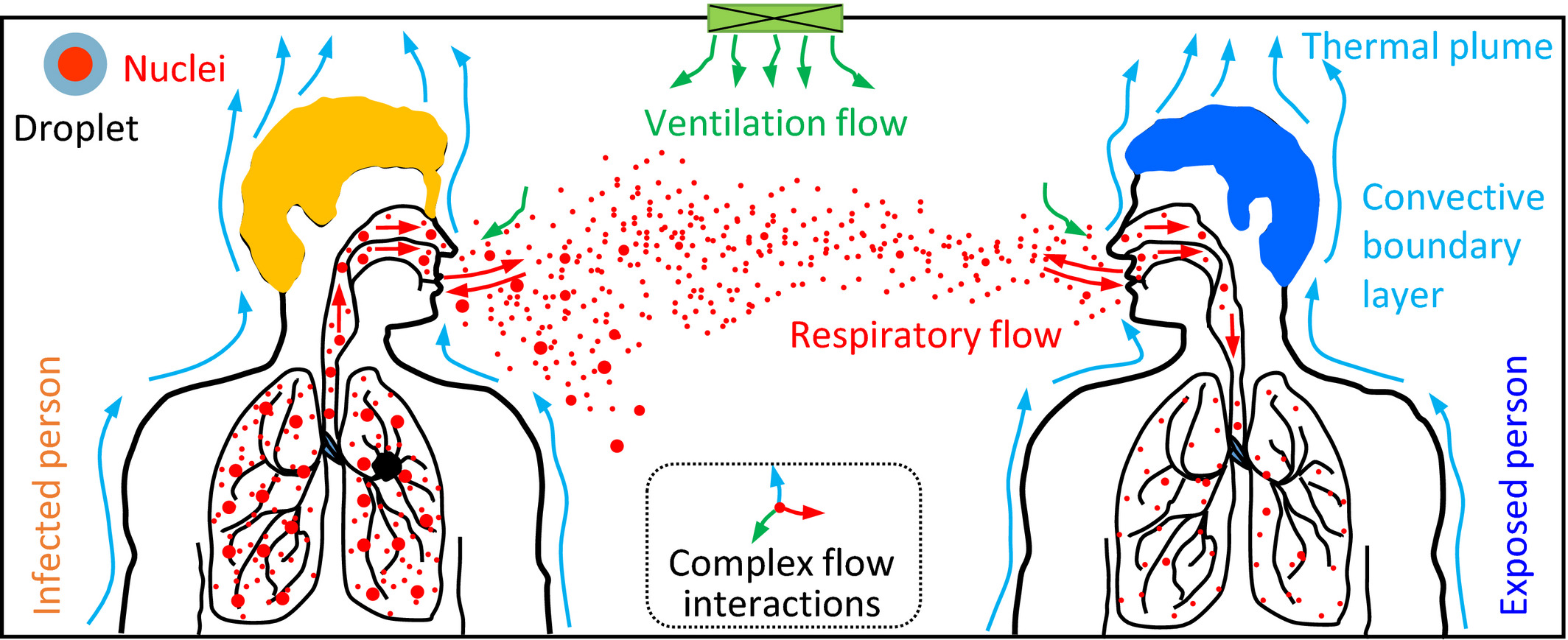 All’epoca, tuttavia, la trasmissione per via aerea veniva ancora ritenuta secondaria rispetto a quella a corto raggio. Le ricerche condotte negli ultimi mesi su scala globale su una serie di focolai di COVID-19 hanno invece dimostrato il ruolo svolto degli aerosol ovvero che il SARS-CoV-2 possa essere trasmesso attraverso le particelle infette che restano sospese nell’aria a lungo viaggiando a una distanza ben maggiore dei quasi due metri raccomandati dall’Organizzazione Mondiale per la Sanità (figura 1).