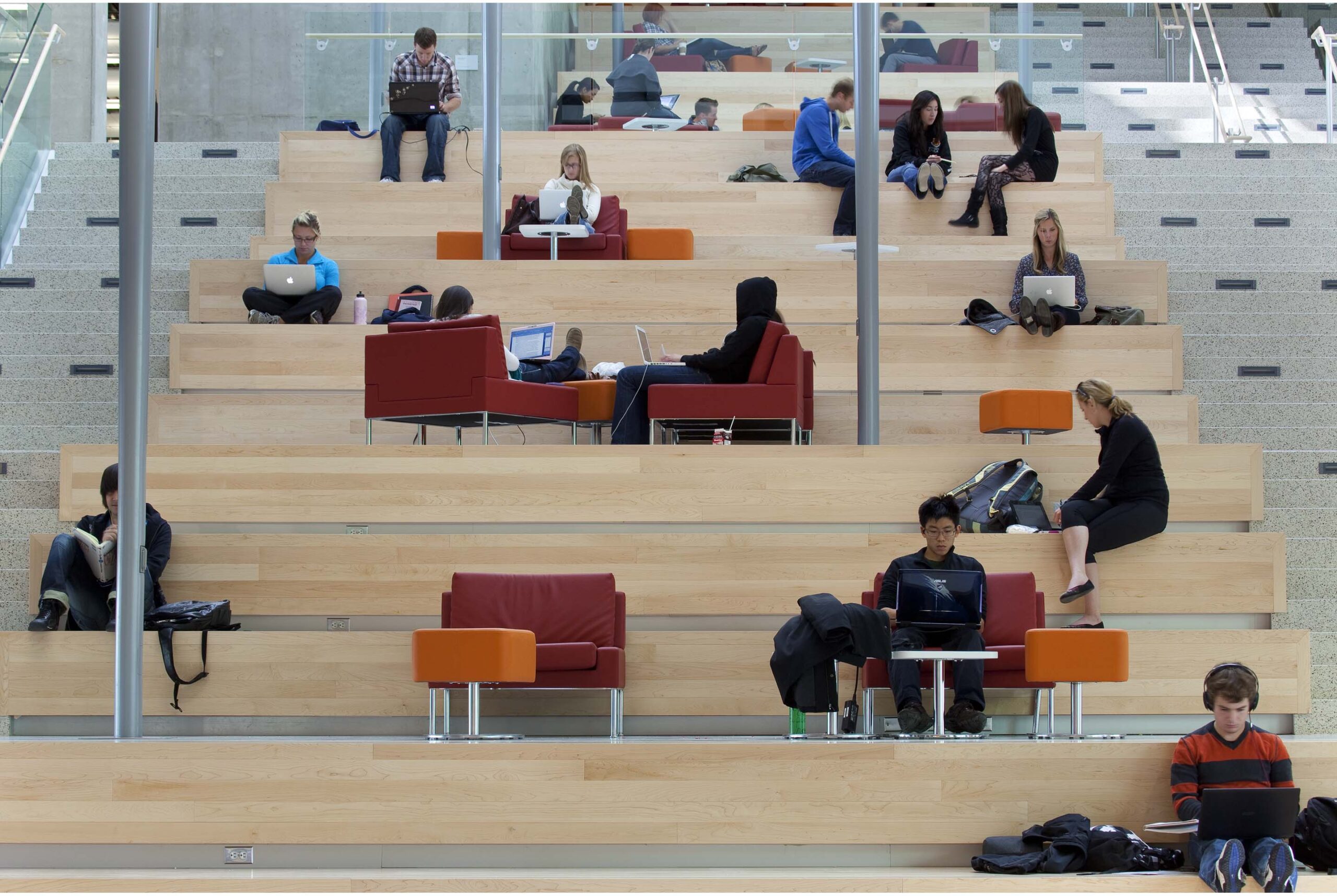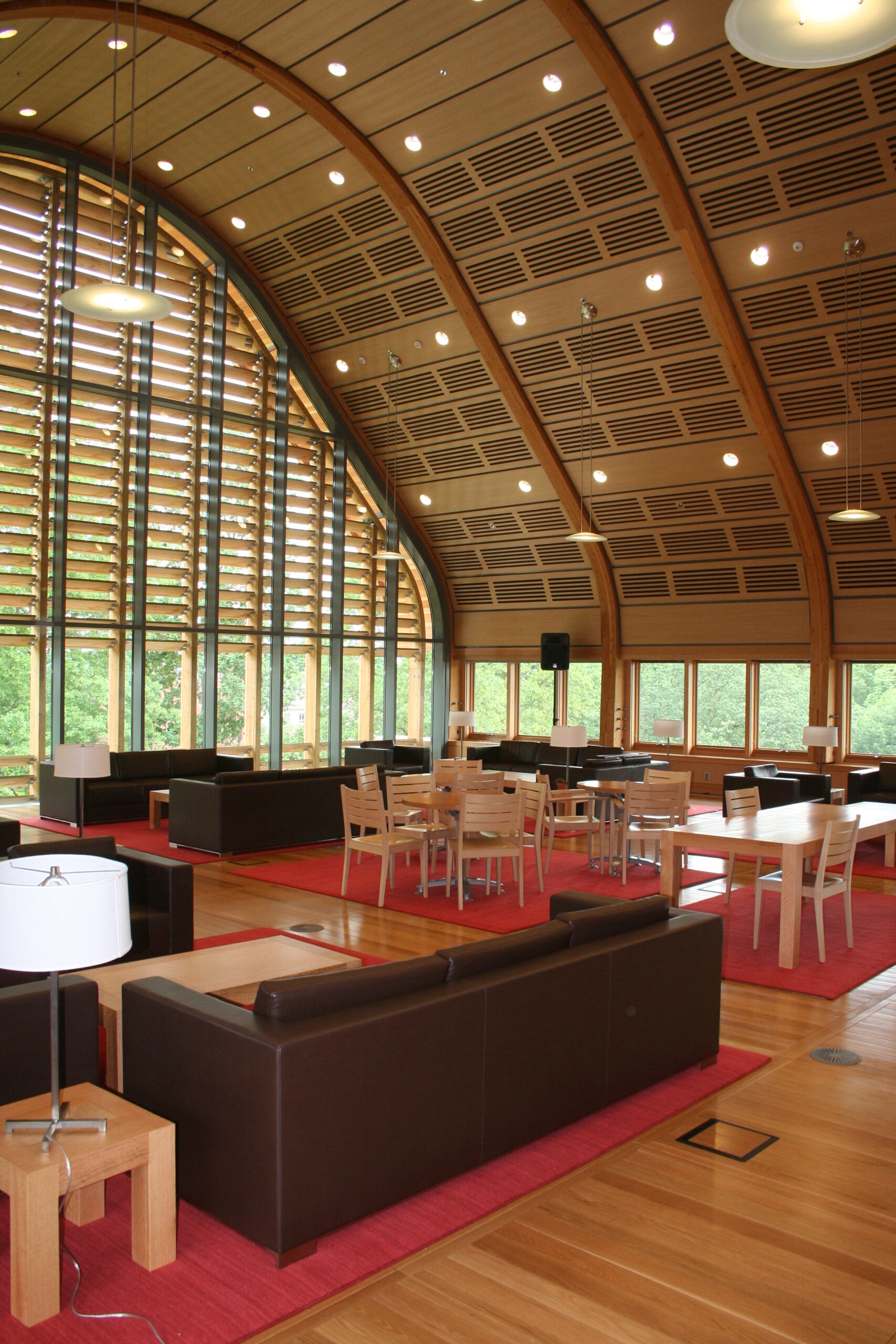 Si tratta peraltro di un concetto già adottato all’estero anche negli edifici commerciali mediante la diffusione dell’aria a dislocamento, con mandata dal basso (a parete o a pavimento) e ripresa dall’alto, eventualmente abbinata a sistemi radianti posti a soffitto. Questa soluzione viene applicata da anni non solo negli edifici per uffici (figura 6) ma anche in scuole, ristoranti e biblioteche (figura 7).