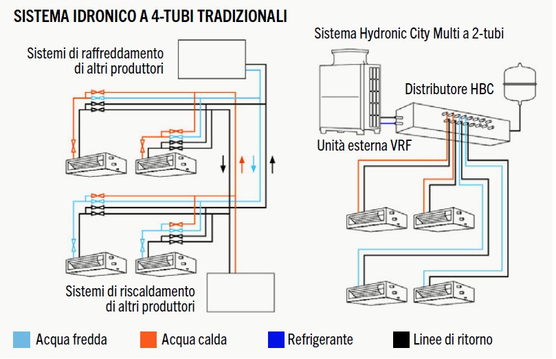 Qui sotto il confronto tra lo schema funzionale di un sistema idronico a 4 tubi e di