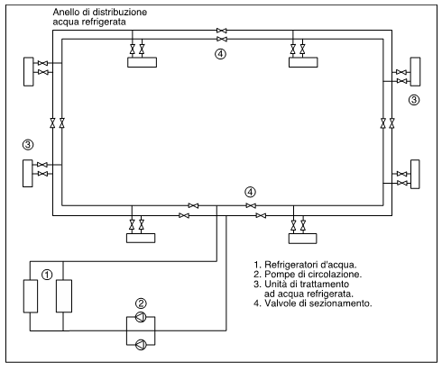 Il sistema di distribuzione dell’acqua refrigerata deve possedere le stesse caratteristiche di affidabilità e di flessibilità del resto dell’impianto. Ciascun componente deve essere provvisto di un’unità di riserva per consentire l’esecuzione delle operazioni di ordinaria manutenzione. La rete di acqua refrigerata deve prevedere la possibilità di una futura espansione con l’aggiunta di altre unità, senza dover interrompere il funzionamento. A tale scopo il circuito di distribuzione viene realizzato ad anello ed è dotato di gruppi di sezionamento dotati di valvole che permettono di intervenire su qualsiasi parte senza interrompere il funzionamento dell’impianto (figura 13).