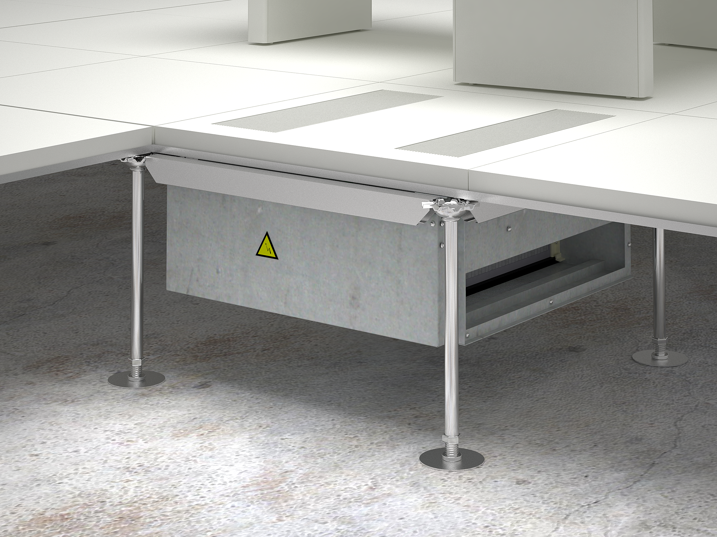 Il plenum sottopavimento deve essere a tenuta, perfettamente pulito e rifinito con un trattamento antipolvere in modo tale da evitare il trascinamento di materiali estranei nel flusso d’aria.