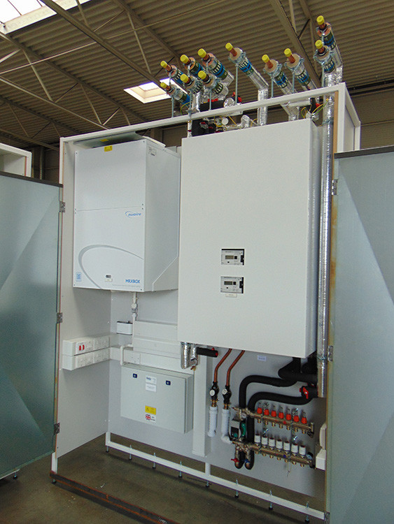 La caratteristica più innovativa è costituita dal fatto che ogni appartamento è dotato di un modulo prefabbricato che contiene sia l’unità per la fornitura dei fluidi termovettori per l’impianto di climatizzazione e per l’acqua calda sanitaria, mediante interfaccia con il sistema di distribuzione dei fluidi, sia l’unità VMC (figura 9).