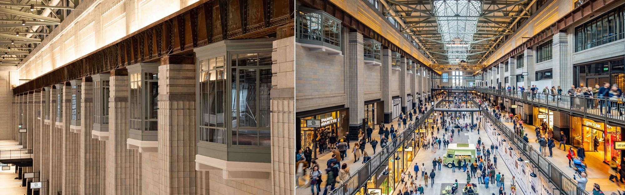 Sui due lati della Boiler House, a est e a ovest, si trovano le due gigantesche sale delle turbine che ora ospitano tre piani di negozi, ristoranti e spazi per eventi speciali (figura 4). Gli interni delle due sale riflettono le loro diverse epoche di costruzione: la Sala A presenta finiture in stile art déco degli anni 30, con lesene scanalate e piastrelle color crema (figura 5), mentre la Sala B, costruita dopo la seconda guerra mondiale, presenta uno stile più industriale.
