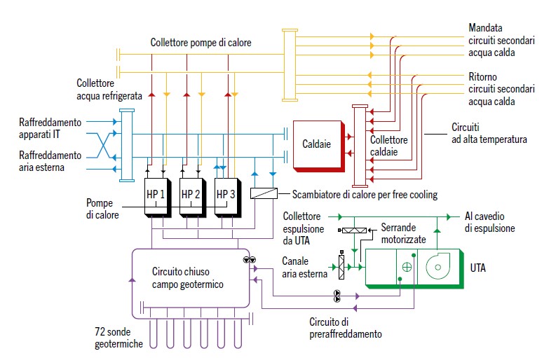 Una piccola pompa di calore è stata prevista per fornire il carico frigorifero di base per gli apparati IT per tutto l’anno, smaltendo il calore nel circuito di riscaldamento, in modo da aumentare l’efficienza energetica globale di riscaldamento/raffreddamento del sistema geotermico.