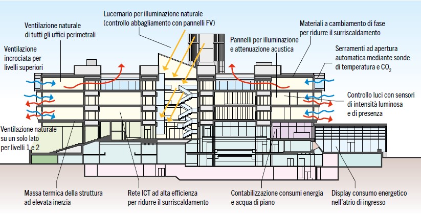 Per raggiungere tali obiettivi sono state adottate diverse soluzioni: una facciata a doppia pelle integrata con un sistema di ventilazione naturale, un sistema di diffusione aria a dislocamento, un campo geotermico, un impianto fotovoltaico per la autoproduzione di energia elettrica in situ e un tetto verde di 500 m2.