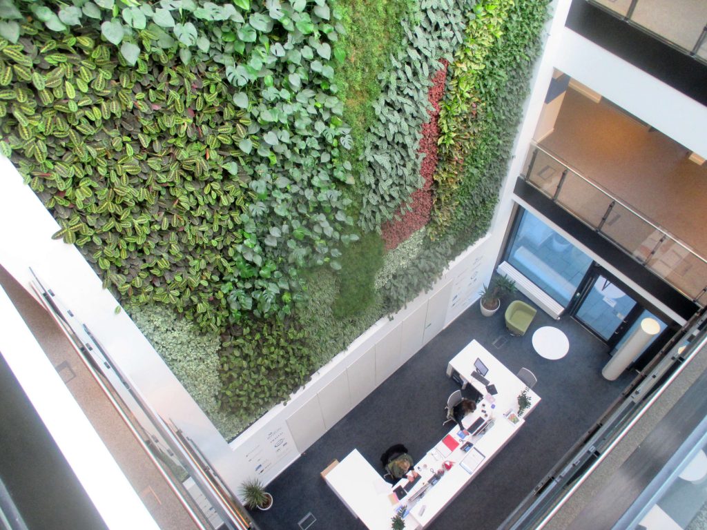 Il cuore dell’edificio è costituito dall’atrio che è stato modificato estendendo il pozzo di luce esistente fino ai piani inferiori, per portare la luce nel cuore dell’edificio, con un lucernario integrato da celle fotovoltaiche (figura 3). L’atrio si sviluppa su 4 livelli ed è caratterizzato da una parete verde a tutt’altezza con una ricca vegetazione, simbolo della biodiversità (figura 4).