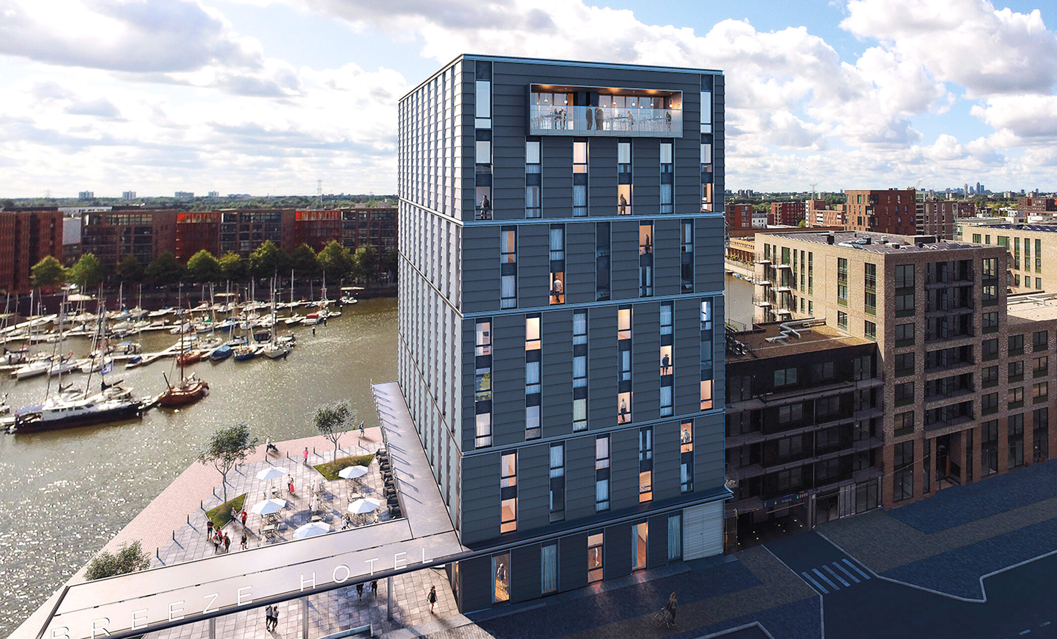 Inaugurato nel 2019 nel quartiere di Ijburg, l’hotel si sviluppa su 9300 m2 e 11 livelli, con la hall di ingresso al piano terra (figura 2) e le 198 camere e le 5 suites situate dal primo al nono piano. L’ultimo livello ospita la sala fitness e lo skybar con un grande balcone che offre la vista sulle acque dell’IJmeer.