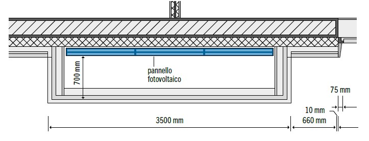 Il dimensionamento dei camini solari si è basato sulla portata di ventilazione totale richiesta dalle camere e dagli spazi comuni, pari a 25.000 m3/h. Per ridurre al minimo la perdita di carico, e consentire quindi il tiraggio naturale, la velocità dell’aria nei camini è stata fissata pari a 1,5 m/s. Di conseguenza è stata calcolata la sezione di passaggio, pari a 4,9 m2, e poi suddivisa in due elementi con larghezza di 3,5 metri e profondità di 700 mm (figura 5).