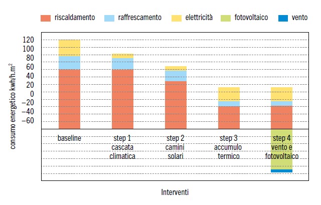 Come baseline di riferimento è stato considerato un consumo energetico annuo di 120 kWh/m2 di un edificio standard. Grazie alla cascata climatica il valore si riduce a 101, con il camino solare scende a 85, con l’accumulo di caldo e di freddo si riduce ulteriormente a 54, mentre il sistema fotovoltaico (ed eventuali pale eoliche) rende l’edificio produttore di energia con un surplus di 5,6 kWh/m2.