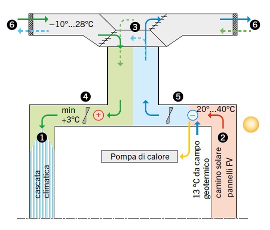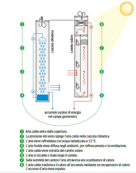 Questo sistema di climatizzazione naturale si basa essenzialmente sulla combinazione di tre elementi tecnologici: camini solari, cascata climatica e pannelli fotovoltaici (figura 4). Nel loro insieme essi svolgono la stessa funzione delle tradizionali unità di trattamento aria, che quindi è stato possibile eliminare.