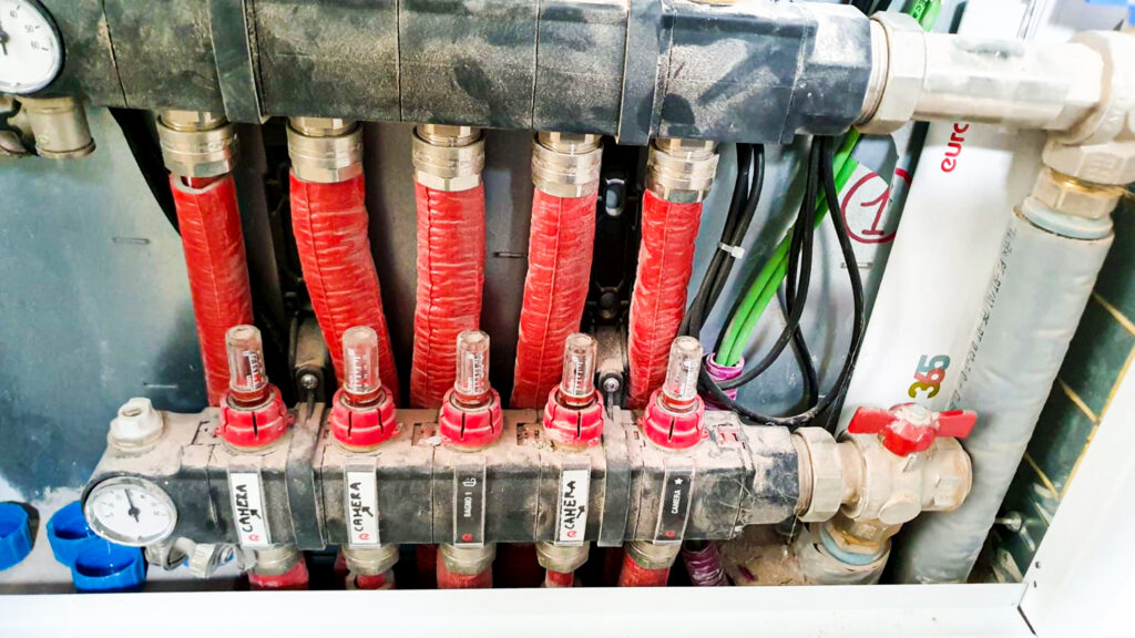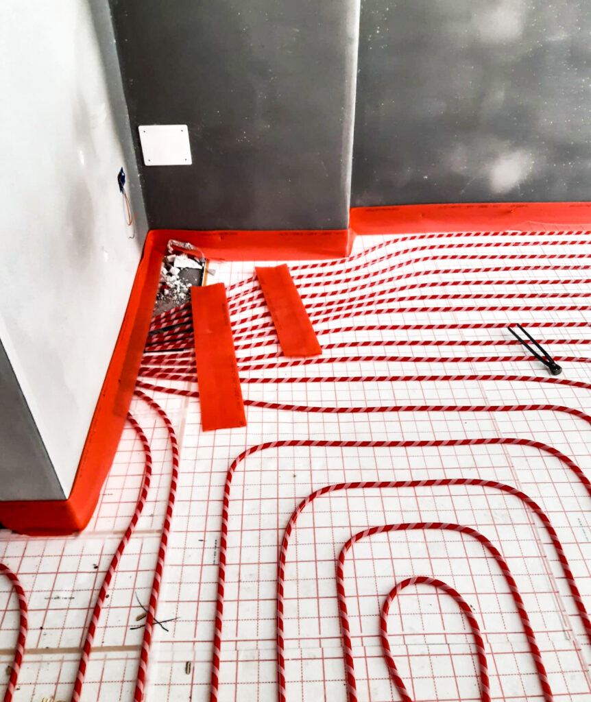 L’alto livello di smorzamento acustico del sottofondo ha anche evitato il ricorso ai pannelli fonoisolanti preformati in materiale plastico per la posa delle tubazioni dell’impianto radiante. Queste sono state ancorate a un semplice foglio adesivo, dallo spessore ridottissimo, che grazie a un sistema simile al velcro consente di posare molto rapidamente le serpentine senza utilizzare clips.