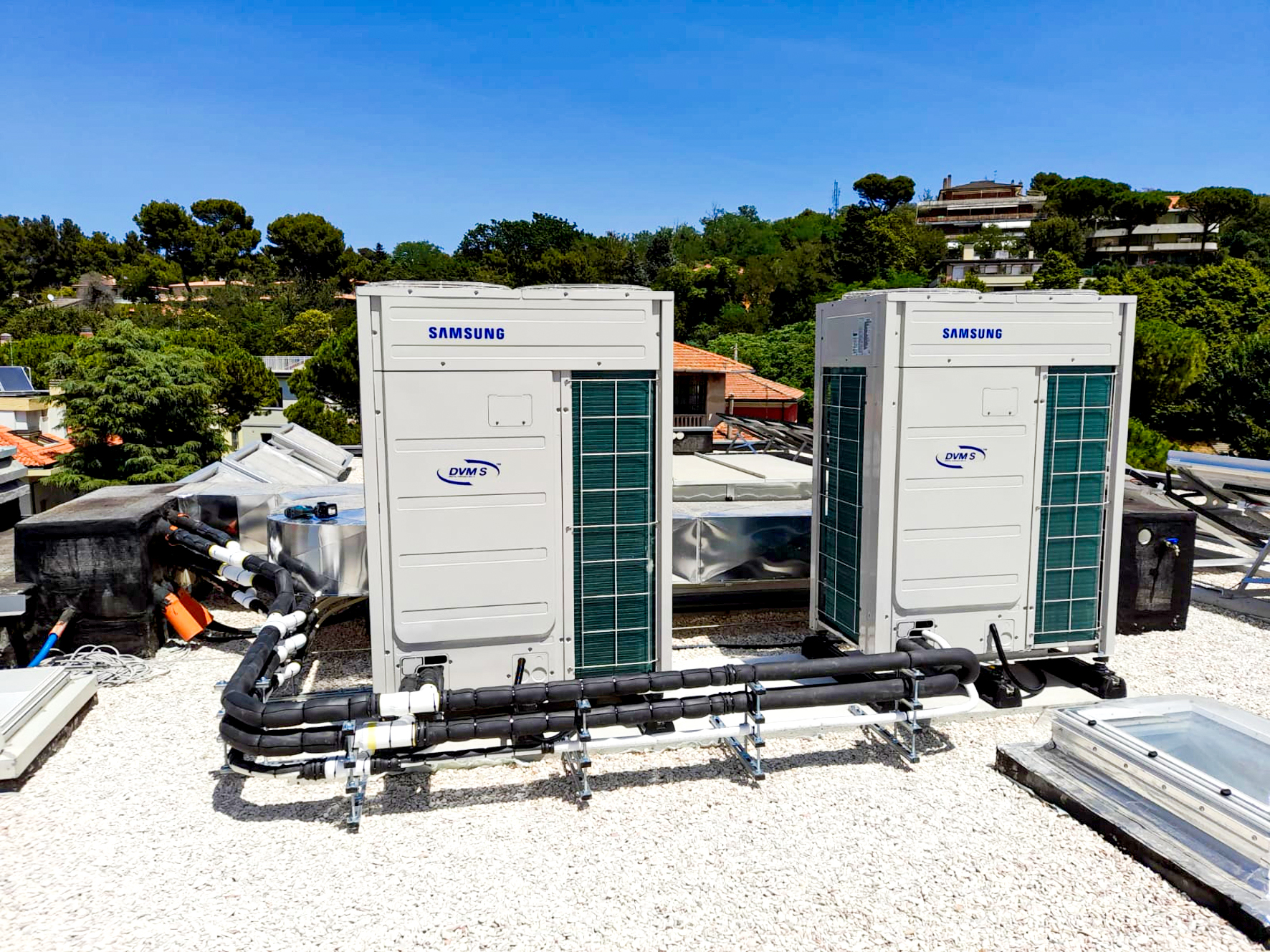 Il sistema VRF è attestato su 2 motocondensanti (ciascuna da 22 CV, pari a: 139,5 kWt; 124,0 kWf) installate sulla copertura, del tipo a recupero di calore equipaggiate con: