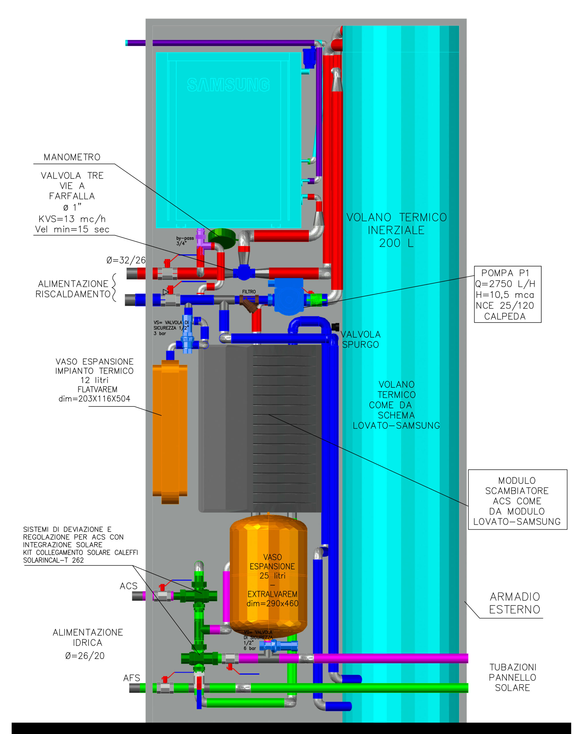- vaso d’espansione (25 l), kit per collegamento al collettore solare termico, scambiatore di calore a piastre, circolatore, serbatoio d’accumulo (220 l), valvole (termostatica, di sicurezza, ecc.), rubinetto di carico impianto, sul circuito ACS.