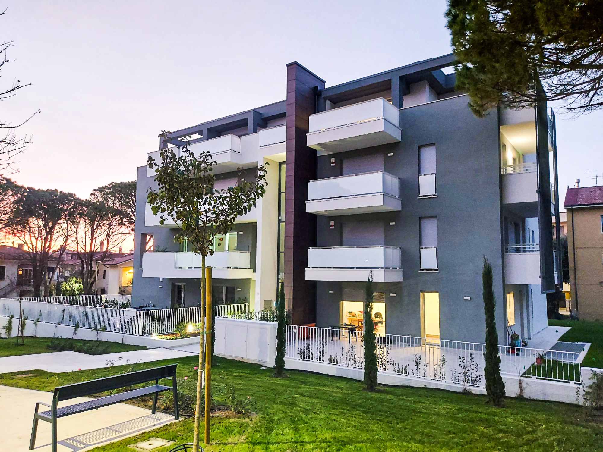 Completato nel 2021, il nuovo edificio condominiale sorge a Pesaro nel quartiere Montegranaro (zona climatica D; 2.083 gradi giorno; temperatura minima di progetto -2 °C; temperatura massima estiva di progetto 30,5 °C). L’edificio è stato realizzato all’interno del giardino dello storico Villino Acciarri, nel quadro di un piano di recupero, e occupa un’area ampia circa 3.600 m2.
