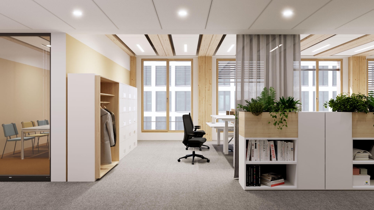 Il lay-out degli uffici è per lo più del tipo open-space, tuttavia è stata prevista una zona centrale su ogni piano in cui l’altezza del controsoffitto è stata abbassata a 2,6 metri per consentire l’installazione delle dorsali di canalizzazioni e tubazioni. Il controsoffitto segue lo stesso percorso lineare lungo il centro degli ambienti come avverrebbe con un corridoio in caso di presenza di partizioni.