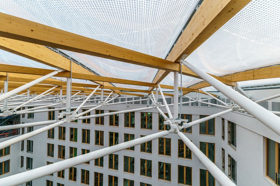 Tutti i piani degli uffici sono collegati tra loro dal grande atrio centrale con una superficie di 1600 m2 e un’altezza di 26 metri. L’atrio presenta una serie di scale volanti che si collegano tra loro e da quattro “alberi” a forma di fungo realizzati in cemento autoportante e rivestiti in legno (figura 2), il più alto dei quali arriva fino a quasi 15 metri mentre il più basso a 4,5. L’atrio conferisce all’edificio il suo carattere, dato che fornisce spazi per riunioni formali e informali, compresi posti a sedere sulla sommità degli alberi, oltre che al piano terra nell’area della caffetteria.