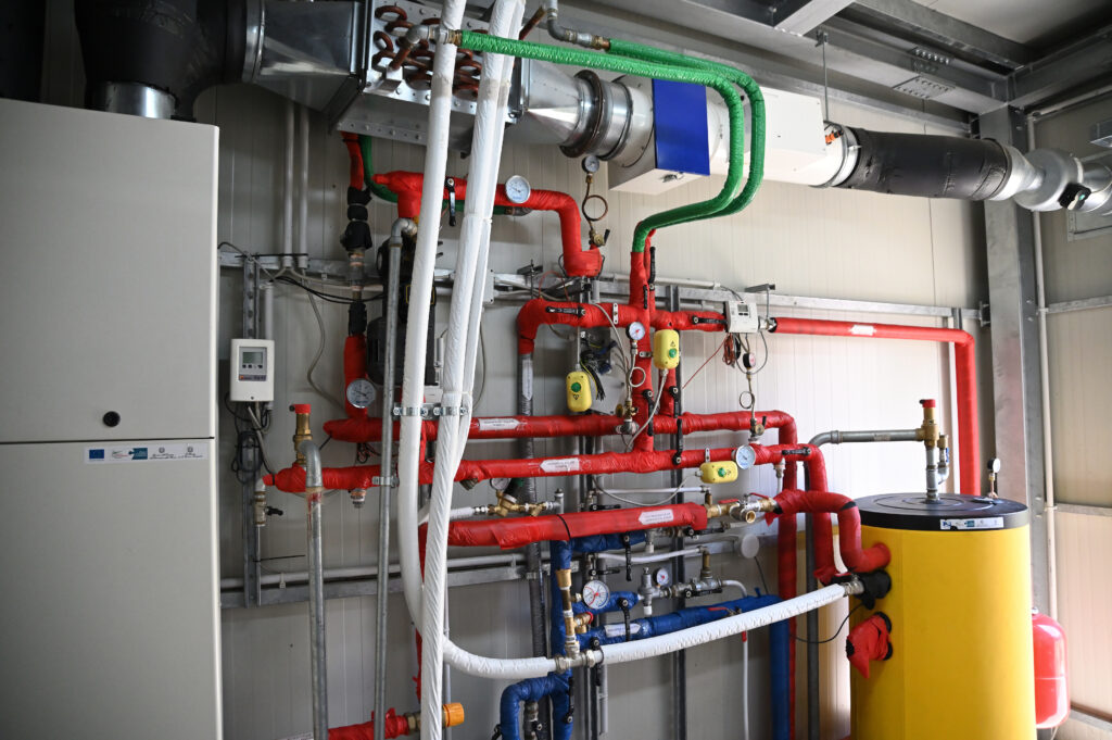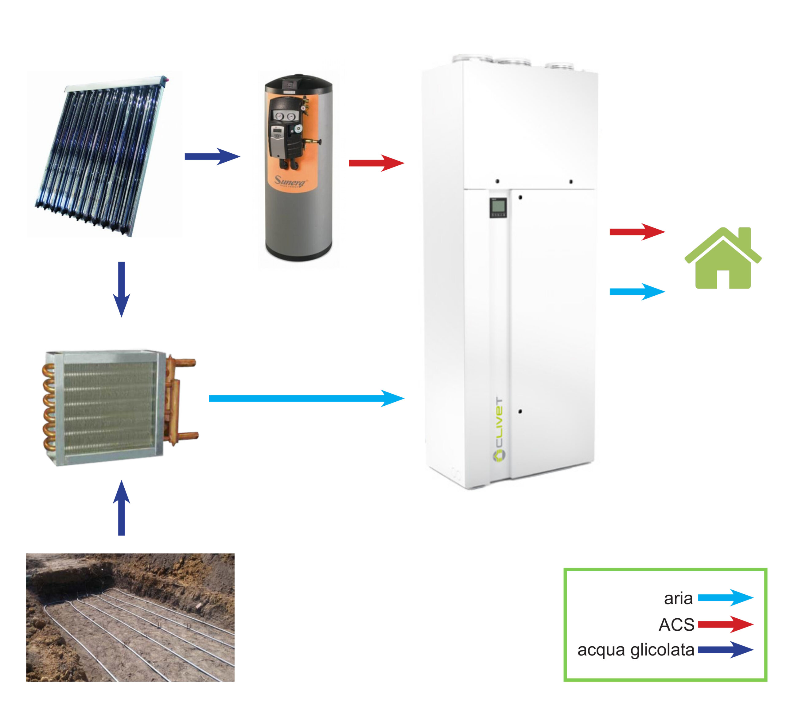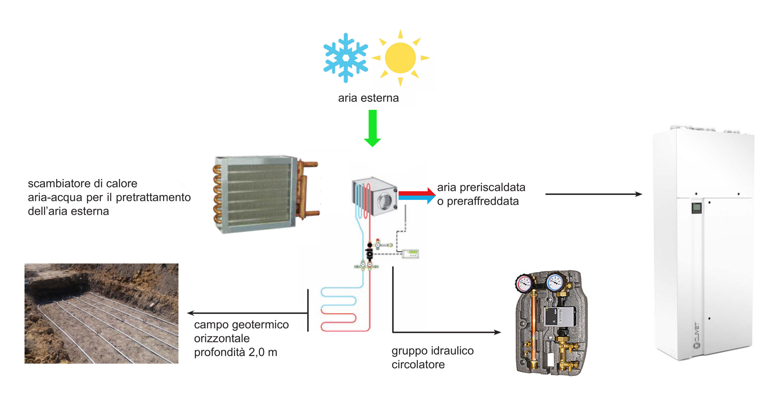 Il campo geotermico è formato da sonde orizzontali interrate (lunghezza circa 100 m; profondità circa 2 m) percorse da una miscela acqua-glicole a circa 16 °C che, durante l’intero arco dell’anno, attuano il pre-riscaldamento/pre-raffrescamento dell’aria in ingresso all’aggregato compatto. In caso di necessità o convenienza, durante il periodo invernale il collettore solare termico può contribuire al pre-trattamento dell’aria.