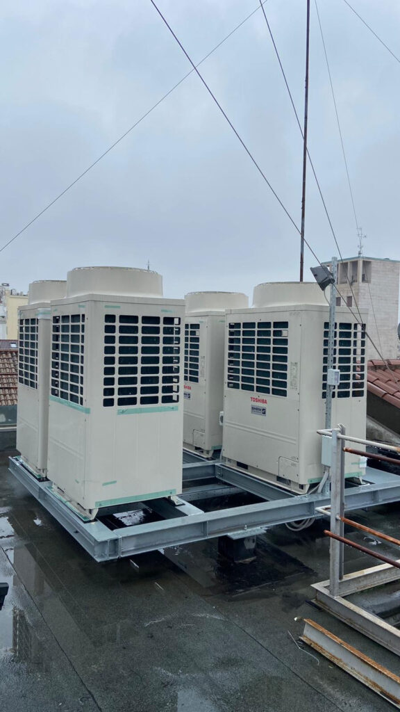 - 4 unità esterne (da 10 HP a 12 HP), installate in copertura su un basamento metallico soprastante una porzione di tetto piano, in posizione non visibile dalle strade circostanti, che alimentano le selettrici situate negli office ai vari piani dell’hotel;