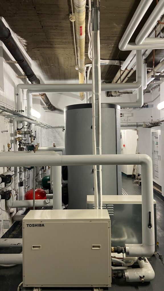 - 4 moduli idronici alloggiati nell’ex centrale tecnica ipogea, assieme a 2 bollitori (ciascuno 1.000 l) e ai circolatori che alimentano la rete di distribuzione dell’ACS.