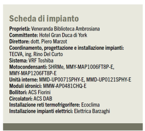 La recente crisi energetica ha offerto un’ulteriore indicazione circa l’opportunità di evitare il ricorso al metano. Per valutare la seconda ipotesi abbiamo fatto riferimento a diverse soluzioni, preferendo quella proposta dal servizio di supporto tecnico di Toshiba Italia Multiclima, che qualche anno prima ci aveva già supportato per il progetto di riqualificazione impiantistica dell’Hotel Spadari al Duomo, anch’esso ospitato in un edificio storico situato nel centro della città, e che anche in questo caso ci ha fornito una valida consulenza a 360 gradi.