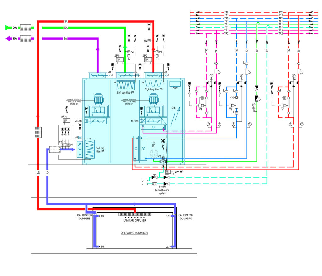 - impianti di ventilazione meccanica del tipo a tutt’aria esterna, per aree critiche quali blocchi operatori, terapie intesive, diagnostiche, la cucina, la sterilizzazione e la la lavanderia, e ad aria primaria, per uffici e studi;