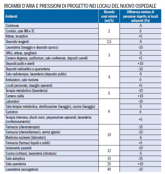 Il rinnovo igienico dell’aria è affidato a 48 UTA (complessivamente: mandata circa 480.000 m3/h) e a 80 ventilatori di espulsione, posizionati nei vani tecnici principali presenti sulle coperture dei diversi corpi del nuovo ospedale. L’impianto aeraulico è utilizzato anche per bilanciare i carichi di riscaldamento o raffrescamento nei singoli ambienti e per fronteggiare l’estrazione forzata dell’aria in alcuni locali equipaggiati con cappe (laboratori, cucina, lavanderia).