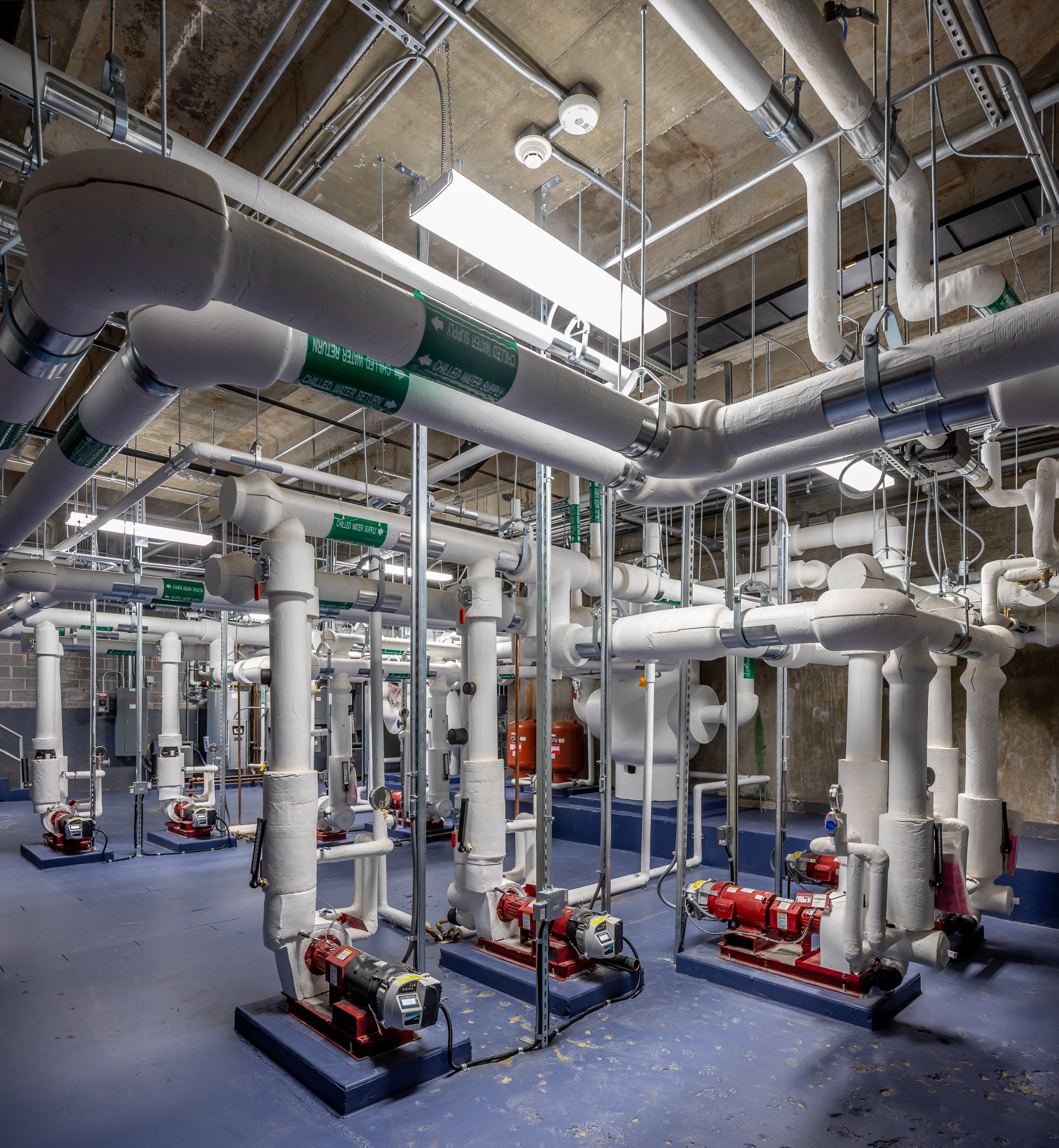 Il gruppo è composto da 3 moduli, ciascuno con potenza frigorifera di 70 kW, e garantisce contemporaneamente la produzione di acqua calda e refrigerata. Valvole di inversione sul circuito frigorifero e valvole motorizzate lato acqua consentono infatti a ogni unità di funzionare in modalità di raffreddamento e di riscaldamento in modo da soddisfare in ogni momento il carico richiesto dalle diverse zone dell’edificio grazie a un circuito di distribuzione a 4 tubi.