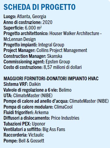 Dopo avere analizzato pro e contro delle due soluzioni, il team ha infine optato per l’impiego del sistema idronico con soffitti radianti, in quanto di livello superiore per quanto riguarda le condizioni di benessere e più efficiente dal punto di vista energetico, oltre a presentare un minore impatto acustico. Inoltre, la scelta è stata motivata dall’obiettivo di dimostrare come sia possibile utilizzare un sistema di raffreddamento radiante anche in un clima con estati calde e umide come quello di Atlanta. Questa opzione presentava un più elevato costo di investimento ma il team ha ritenuto che i benefici fossero in grado di consentire un recupero dell’investimento anche in termini di produttività grazie ai più elevati livelli di IAQ.