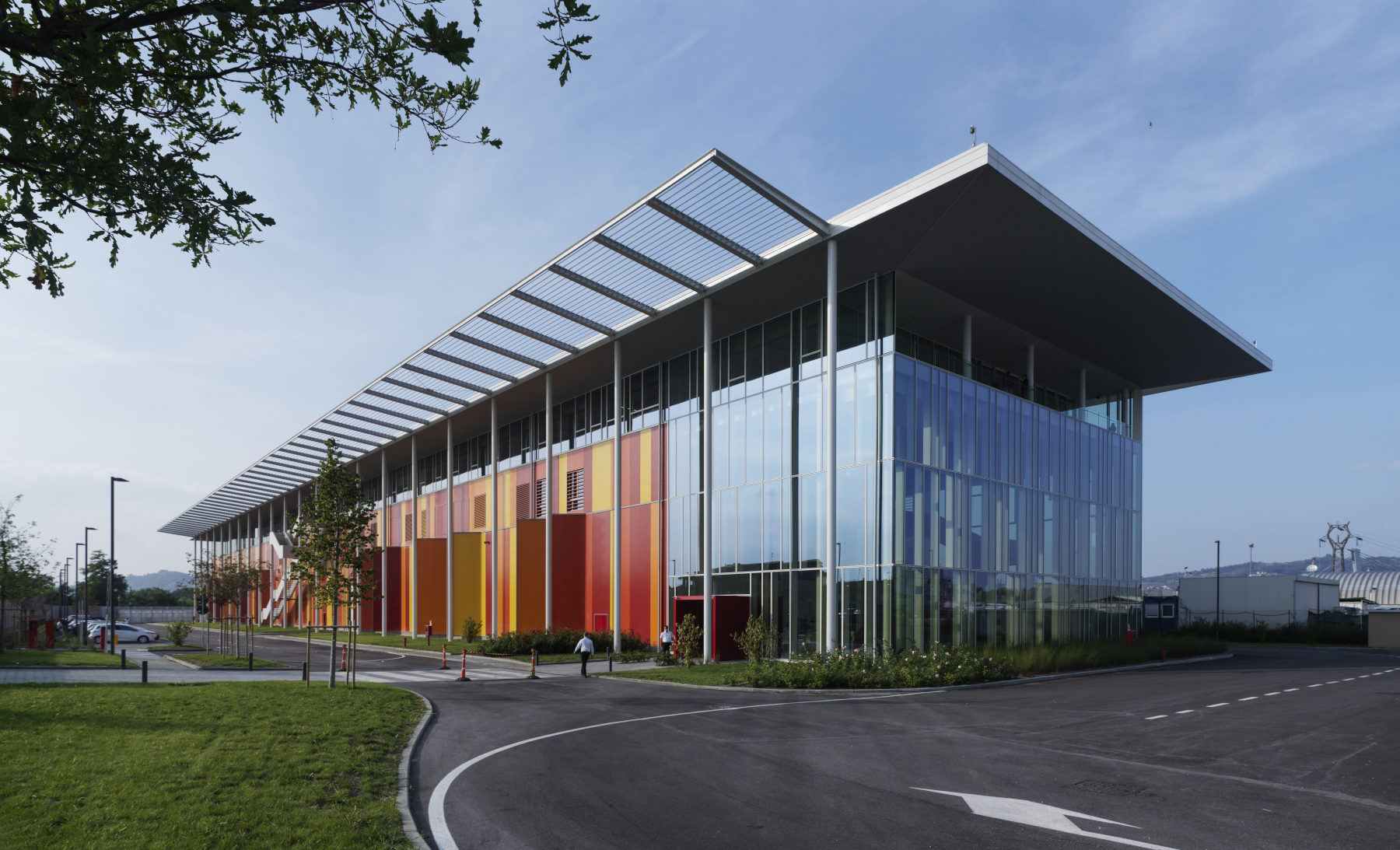 Il volume parallelepipedo è caratterizzato dalle superfici trasparenti della hall a tutta altezza, rivolta verso lo stabilimento, e dell’area per gli uffici, che occupa l’ultimo livello. Il resto dell’involucro è prevalentemente opaco, rivestito con pannelli insonorizzanti e scandito da vetrate verticali, che illuminano gli spazi a vocazione tecnica. Un porticato con frangisole sostiene la copertura aggettante, occupata da un campo fotovoltaico (circa 300 kWp).