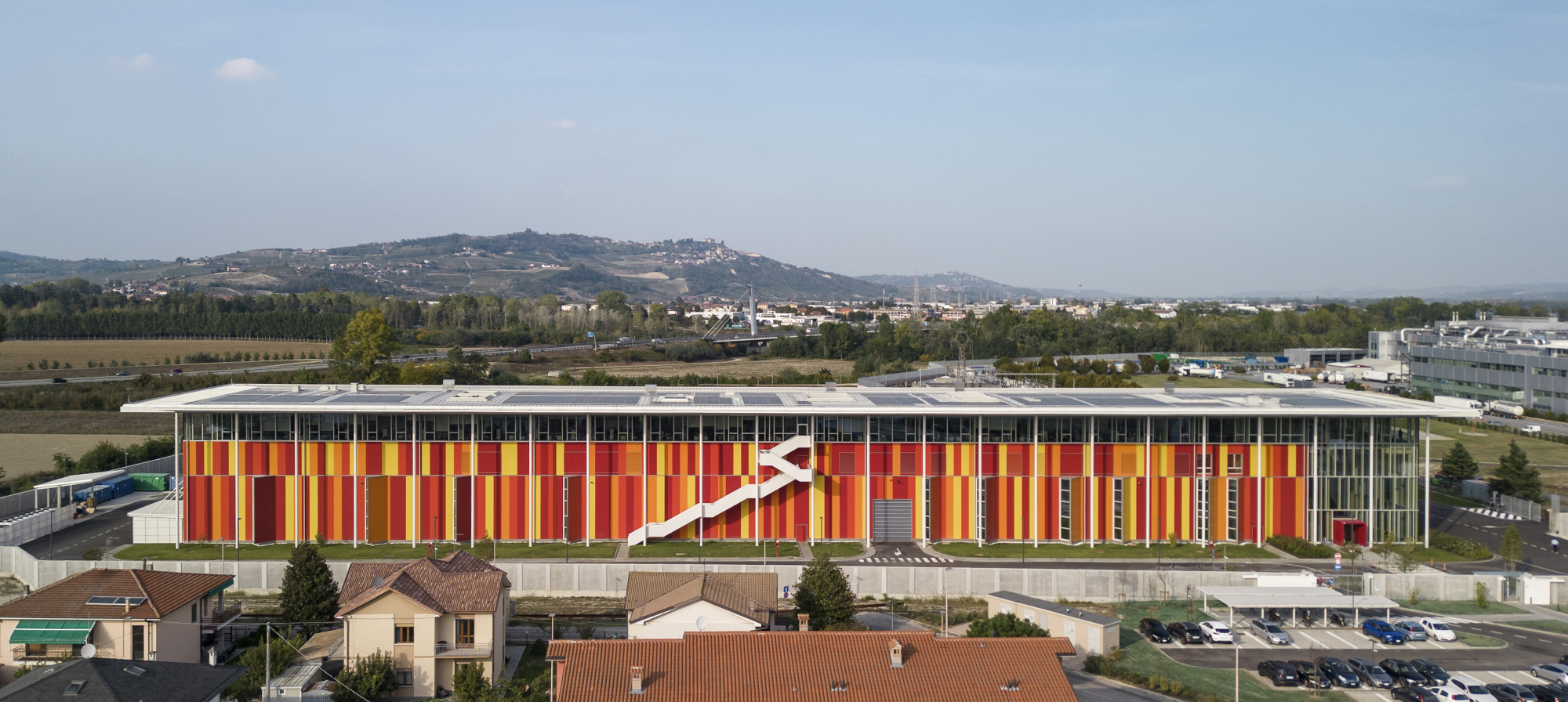 FTC (superficie circa 12.700 m2) sorge a ponente rispetto allo stabilimento, circondato da coltivazioni di nocciole – la pregiata materia prima alla base di molti prodotti dolciari. Vincitore di un concorso di architettura a inviti, il progetto sviluppato da Frigerio Design Group reinterpreta il panorama, la natura e i colori delle Langhe attraverso geometrie astratte, che ammantano le facciate con ampie campiture nelle calde tonalità del giallo e del rosso.