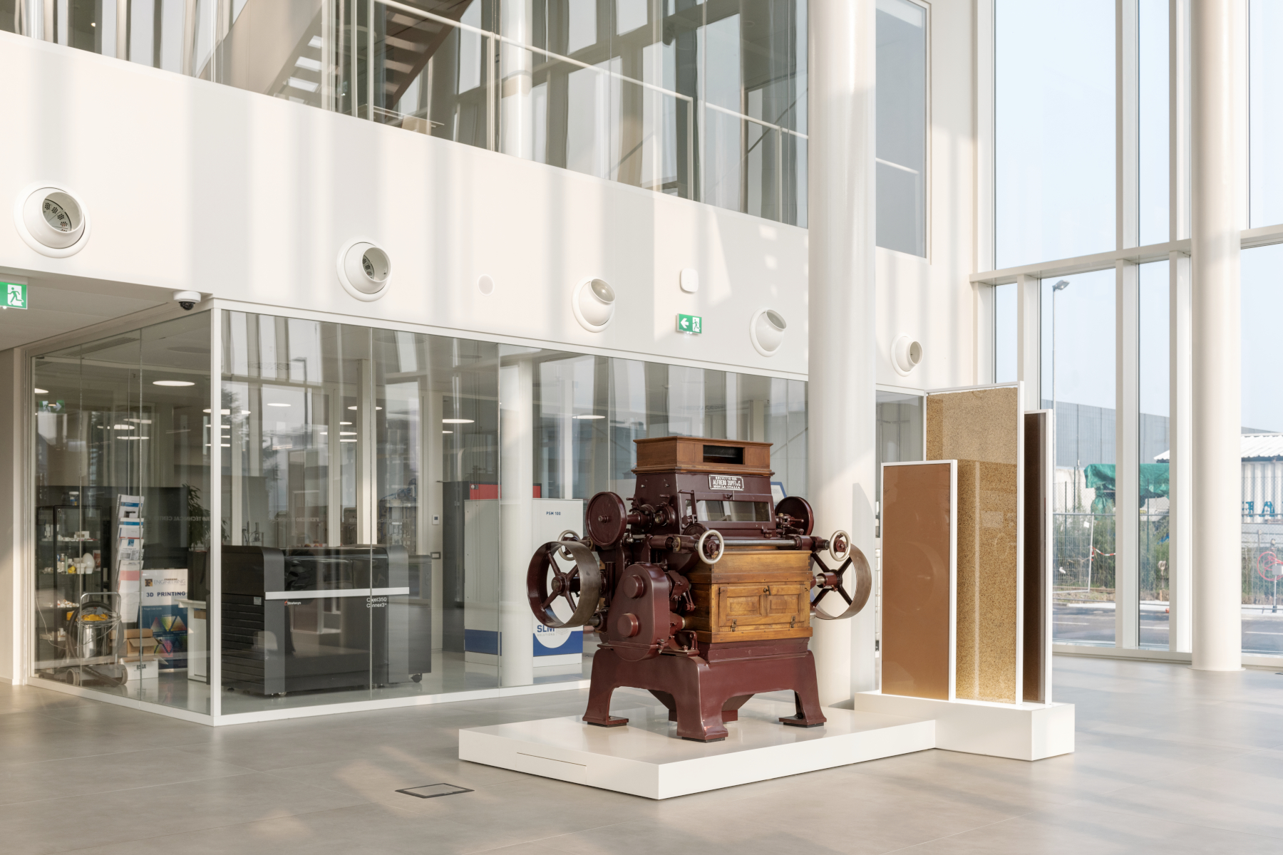 Attraversata da una suggestiva scalinata, la hall è uno spazio estremamente luminoso nel quale le aree per l’accoglienza si alternano a un’esposizione tematica. L’officina è un ampio ambiente dai tratti essenziali, con aperture in facciata che consentono la penetrazione della luce naturale proteggendo dall’irraggiamento diretto. Aperti verso il paesaggio, gli uffici sono suddivisi da pareti trasparenti, con pochi elementi fissi e geometrie coordinate che restituiscono un’elevata flessibilità.